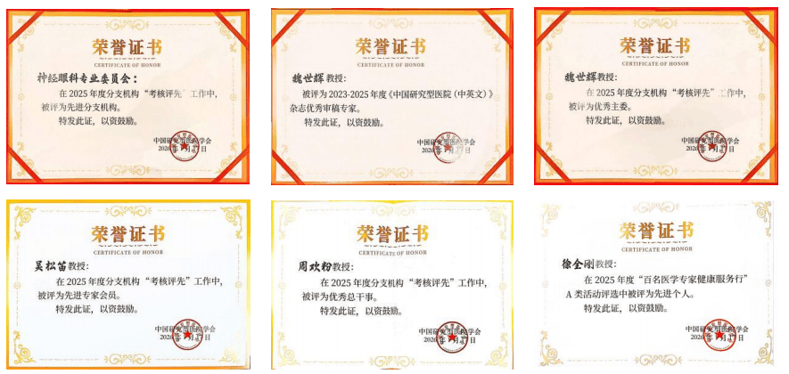 与此同时,在2025年度分支机构考核评先工作中,神经眼科专业委员会凭借扎实的工作成效与突出的行业贡献,斩获多项荣誉,充分彰显了学科团队的强大凝聚力与综合实力。其中,神经眼科专业委员会获评先进分支机构,魏世辉教授履职尽责、引领有方,获评优秀主委,同时凭借在学术评审领域的严谨态度与专业素养,斩获2023-2025年度《中国研究型医院(中英文)》杂志优秀审稿专家称号;吴松笛教授深耕履职、实绩显著,获评先进专家委员;周欢粉教授恪尽职守、统筹高效,获评优秀总干事;徐全刚教授积极投身公益、践行医者使命,因在健康服务中的突出表现,被评为“百名医学专家健康服务行”活动先进个人。一众荣誉的加持,为学科高质量发展凝聚了更强信心与奋进力量。